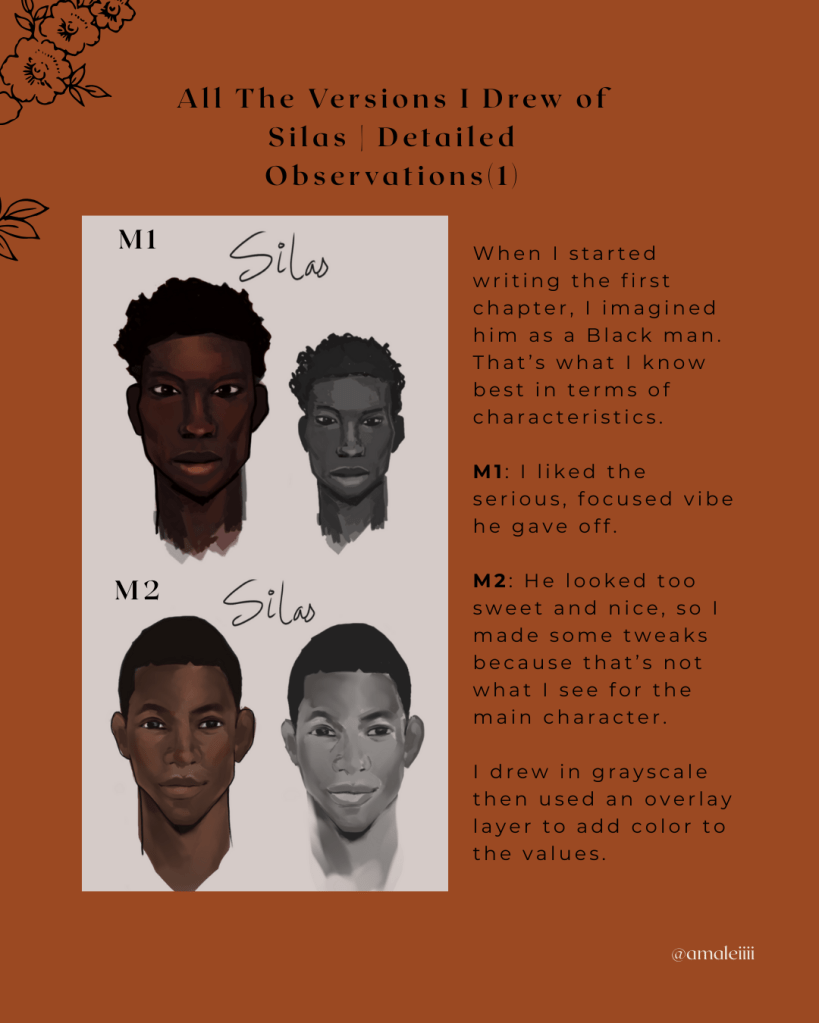 When I first started figuring out how Silas would look, I imagined him as a black man. I went on Pinterest and collected references of different black men, picking people based on the vibes they gave off. The reference for M1 had this serious, cool, strict energy, while M2 felt kind and warm.
